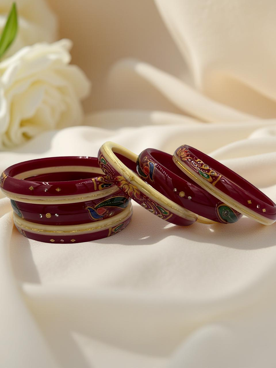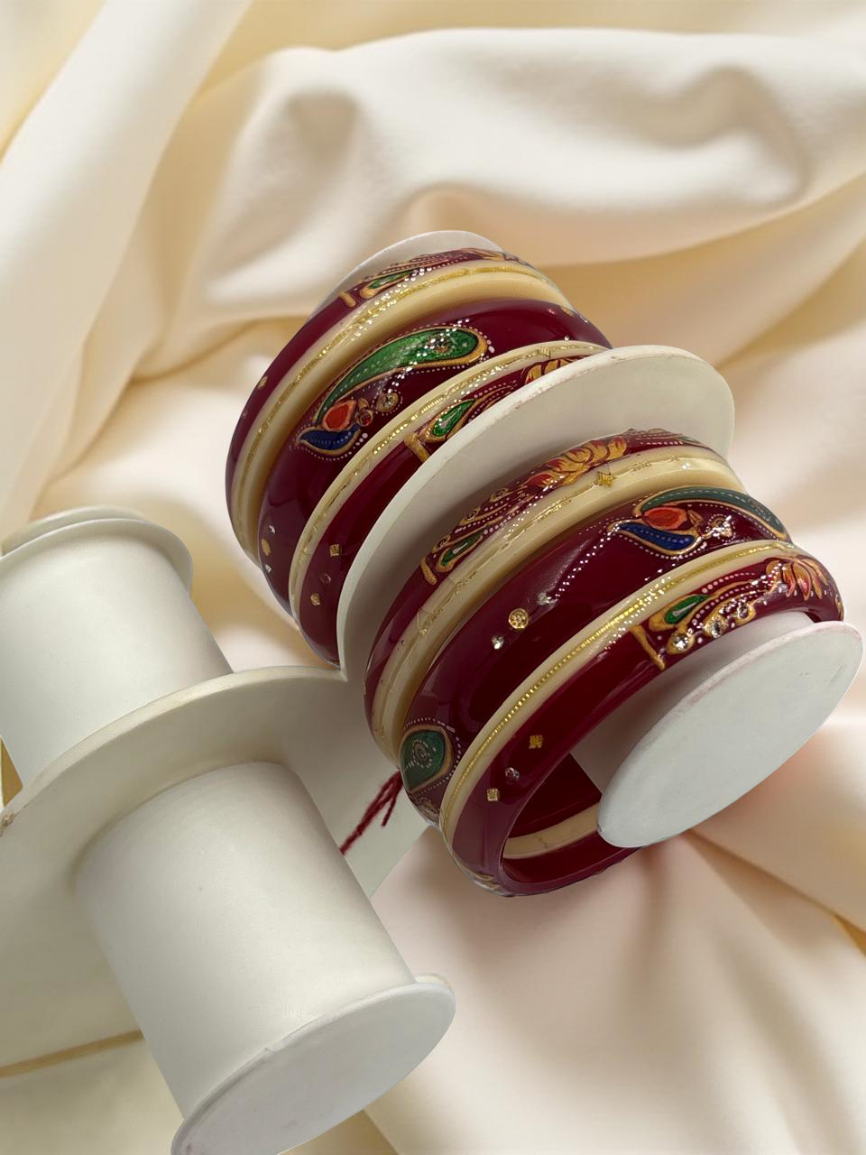 What sets this chuda set apart is its magnificent finish. Each individual bangle is meticulously hand-painted by top artists from across the country. This dedication to fine detail gives the set a genuinely rich, traditional, and artistic finish, ensuring no two sets are exactly alike. The vibrant colors and intricate patterns evoke the opulence of classic Indian bridal wear.