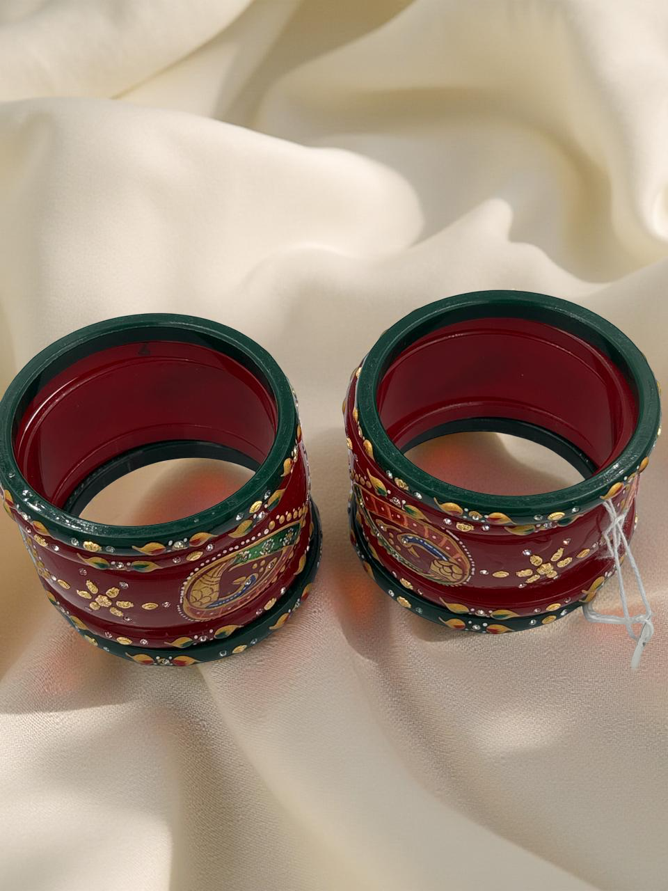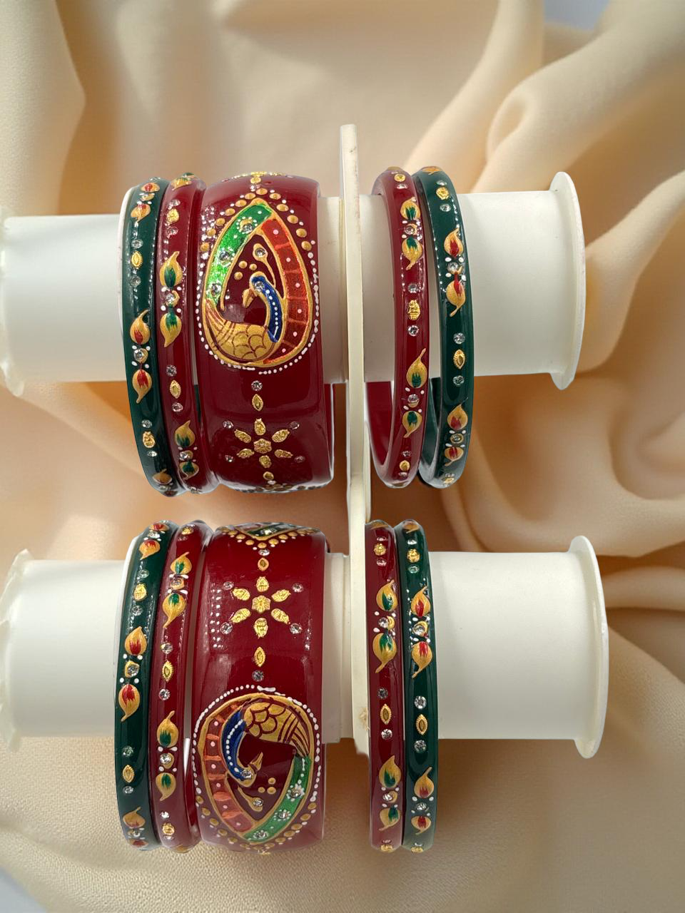 What sets this chuda set apart is its magnificent finish. Each individual bangle is meticulously hand-painted by top artists from across the country. This dedication to fine detail gives the set a genuinely rich, traditional, and artistic finish, ensuring no two sets are exactly alike. The vibrant colors and intricate patterns evoke the opulence of classic Indian bridal wear.