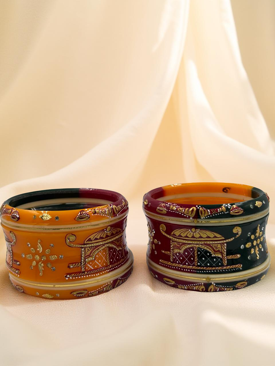 What sets this chuda set apart is its magnificent finish. Each individual bangle is meticulously hand-painted by top artists from across the country. This dedication to fine detail gives the set a genuinely rich, traditional, and artistic finish, ensuring no two sets are exactly alike. The vibrant colors and intricate patterns evoke the opulence of classic Indian bridal wear.