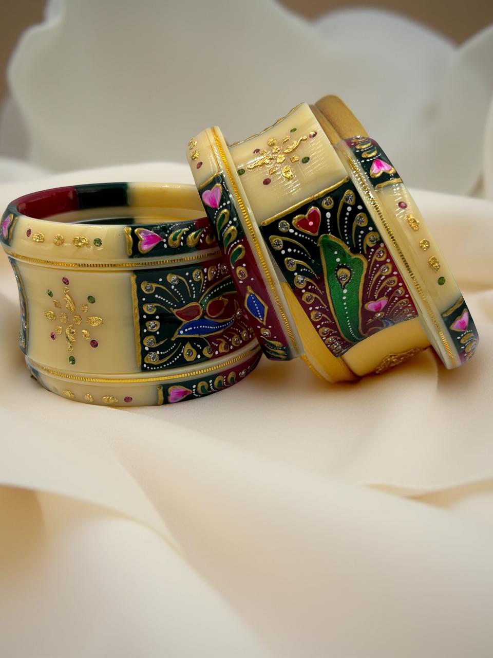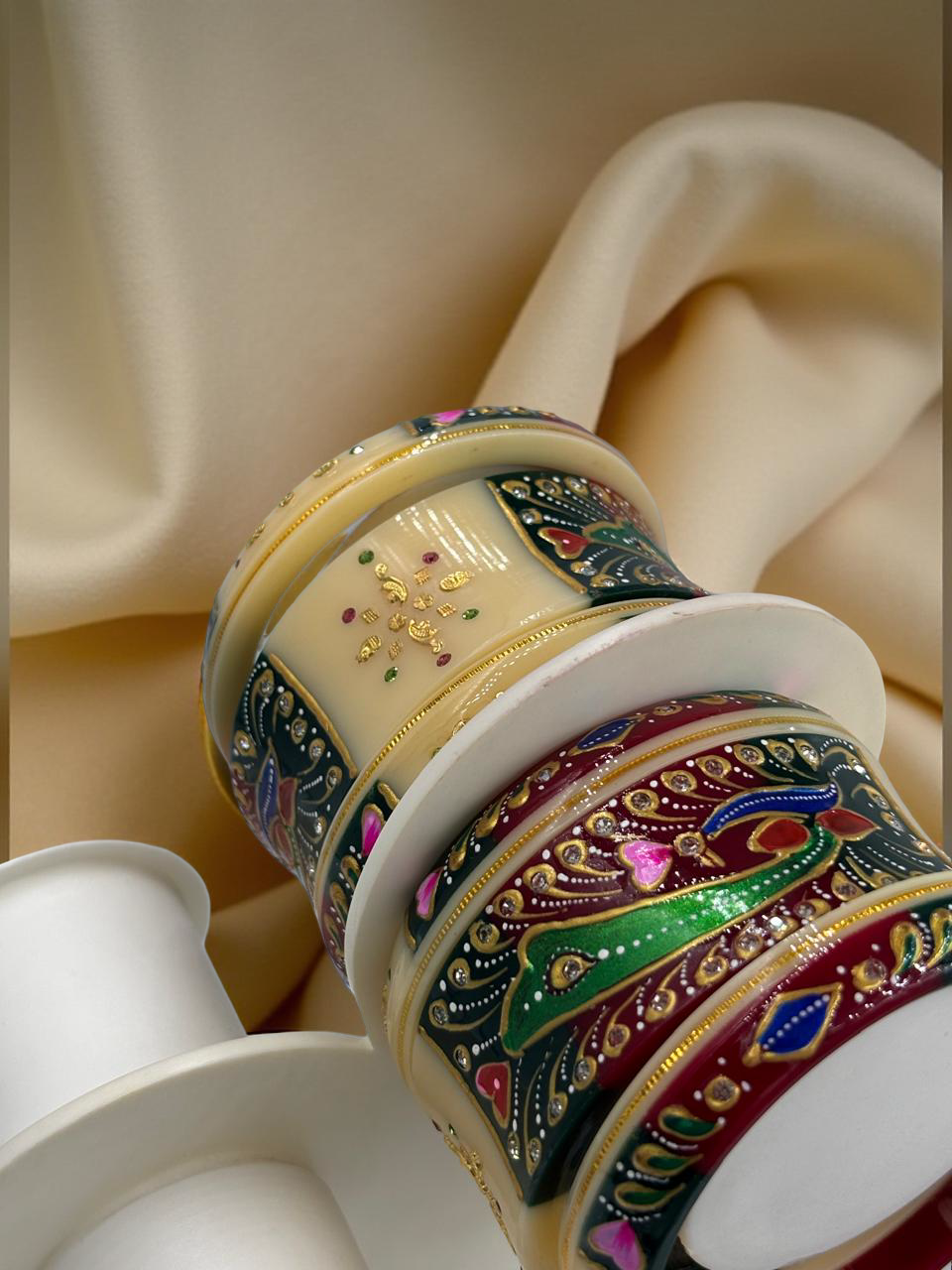 What sets this chuda set apart is its magnificent finish. Each individual bangle is meticulously hand-painted by top artists from across the country. This dedication to fine detail gives the set a genuinely rich, traditional, and artistic finish, ensuring no two sets are exactly alike. The vibrant colors and intricate patterns evoke the opulence of classic Indian bridal wear.