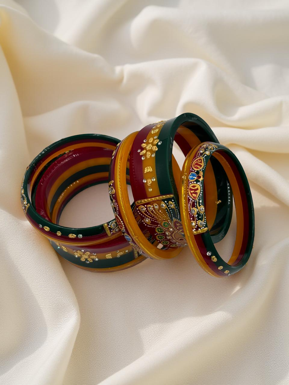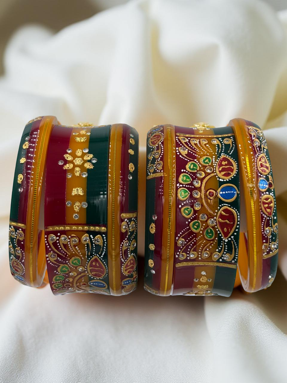 What sets this chuda set apart is its magnificent finish. Each individual bangle is meticulously hand-painted by top artists from across the country. This dedication to fine detail gives the set a genuinely rich, traditional, and artistic finish, ensuring no two sets are exactly alike. The vibrant colors and intricate patterns evoke the opulence of classic Indian bridal wear.