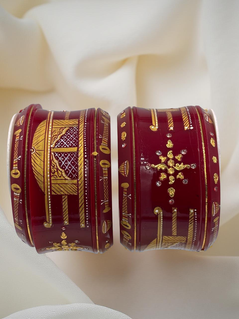What sets this chuda set apart is its magnificent finish. Each individual bangle is meticulously hand-painted by top artists from across the country. This dedication to fine detail gives the set a genuinely rich, traditional, and artistic finish, ensuring no two sets are exactly alike. The vibrant colors and intricate patterns evoke the opulence of classic Indian bridal wear.